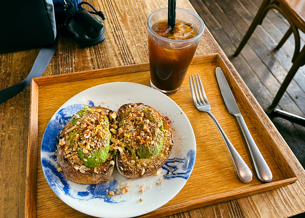 Avocado toast and iced coffee for lunch at Bricolage Bread & Co.