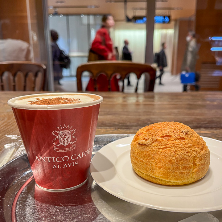 A late afternoon hot chocolate and cream puff at Antico Caffe.