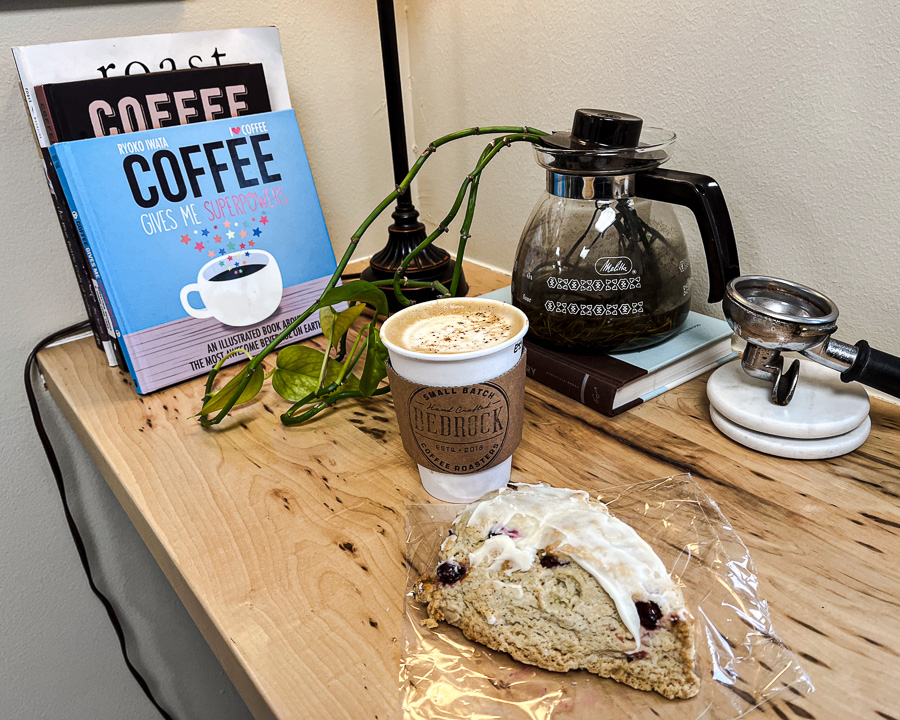 An egg nog latte and a cranberry-vanilla scone at Bedrock
